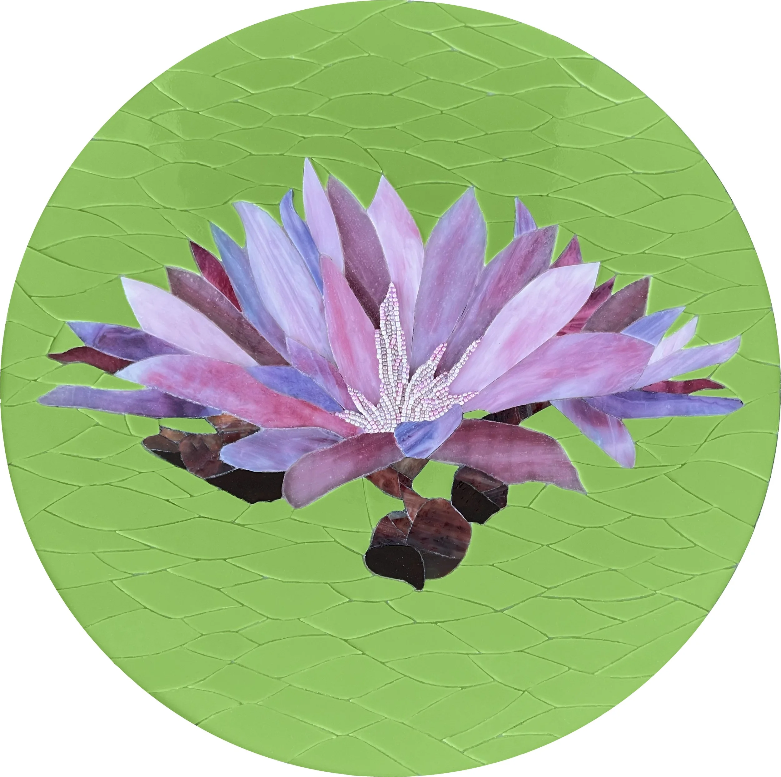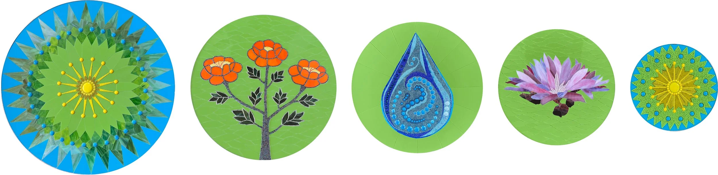 Spring I: A mosaic with radial symmetry emphasizing spring green with the summer yellow peeking in the center and the winter blue washing away.