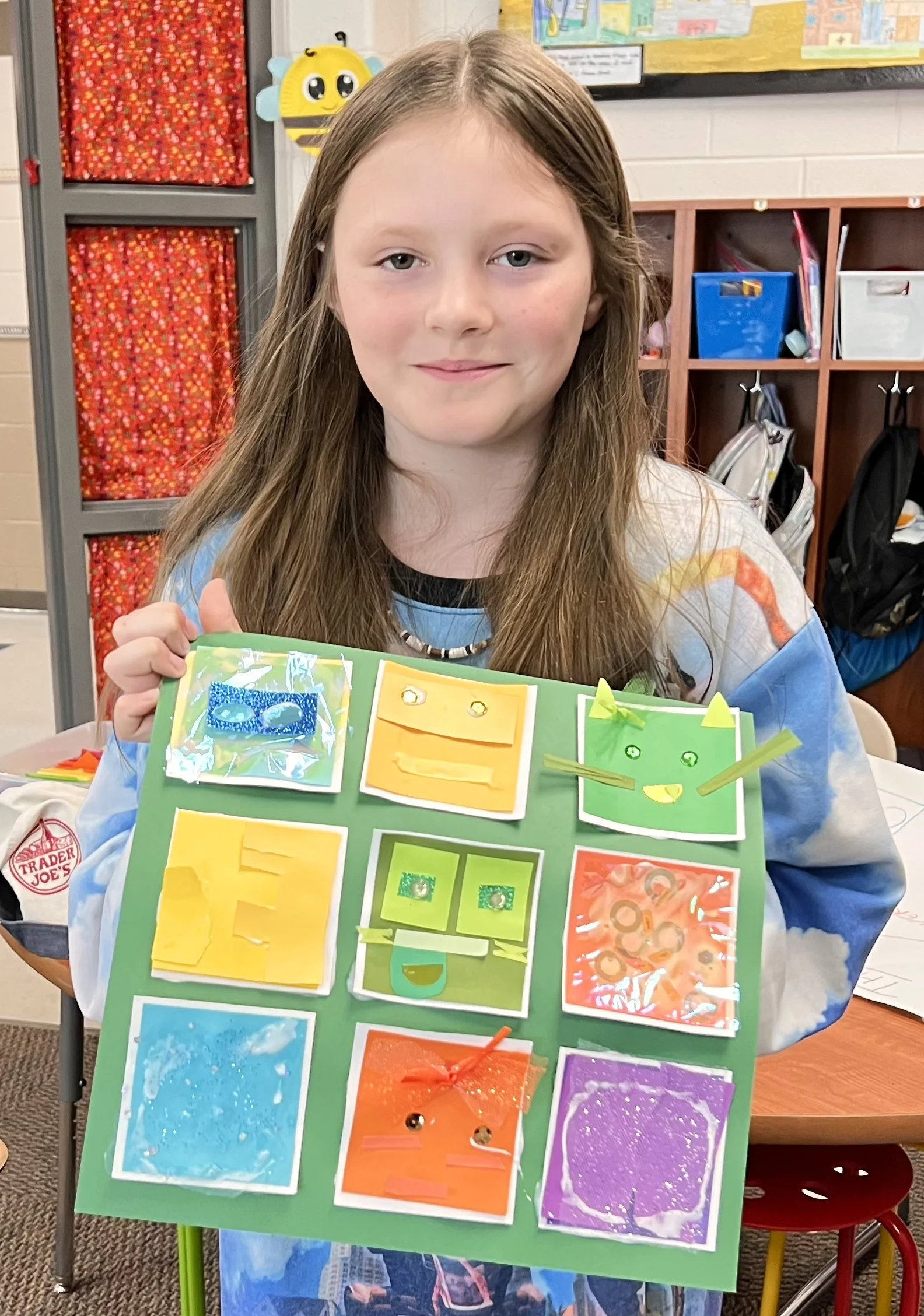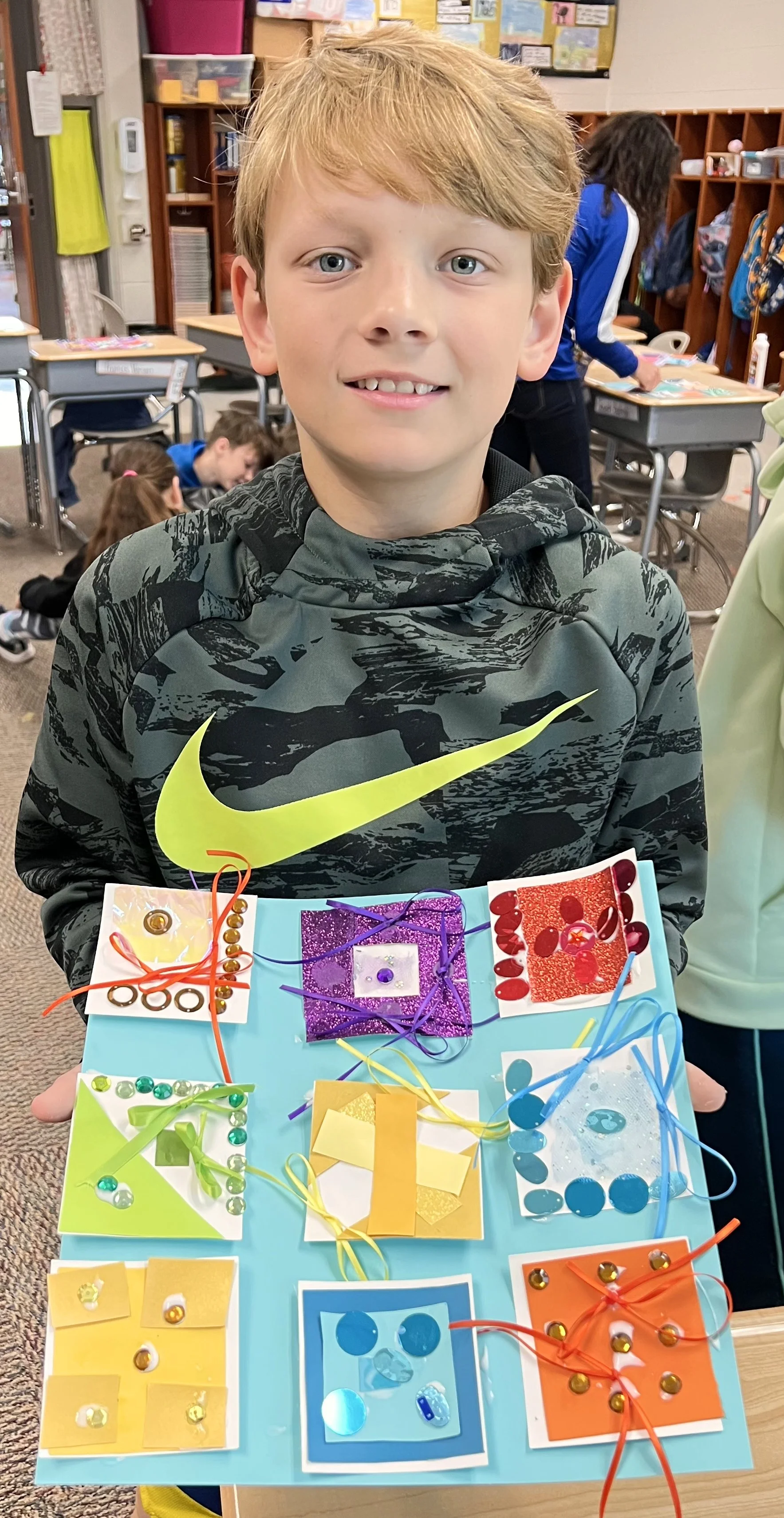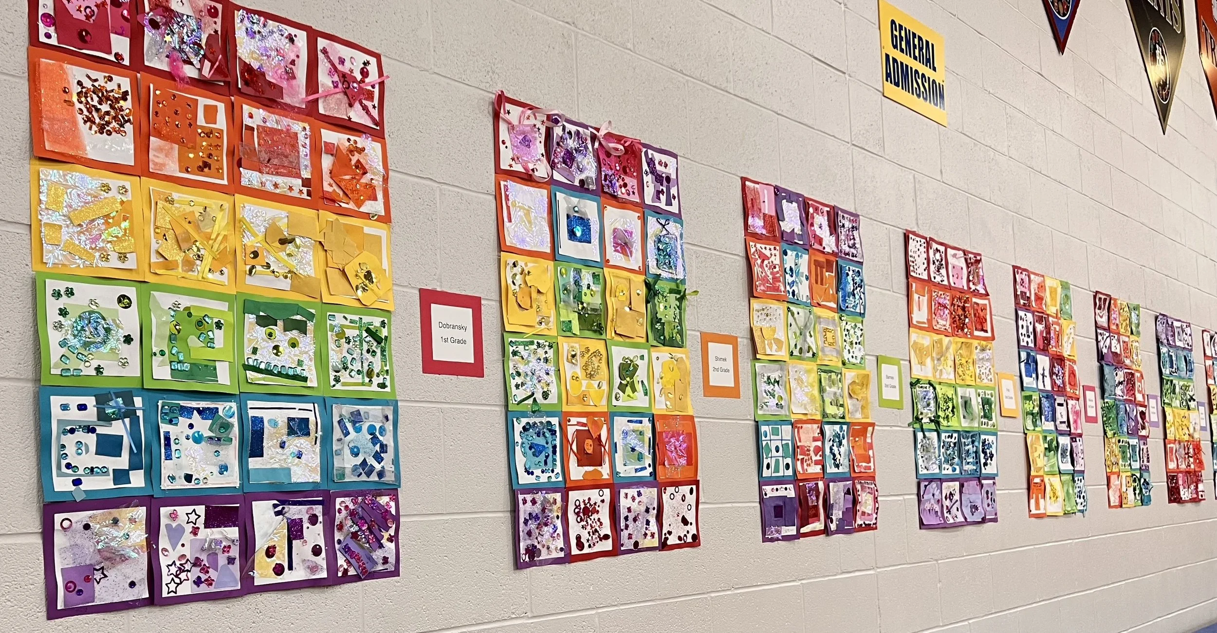 These kids read The Quiltmaker’s Gift, learning how giving and sharing are a part of community. The collage quilts came together by sharing colorful and tactile craft items to make their warm & cool squares that they put together for their own personal 9 square quilts and then contributed to their classroom community for the large classroom quilt.