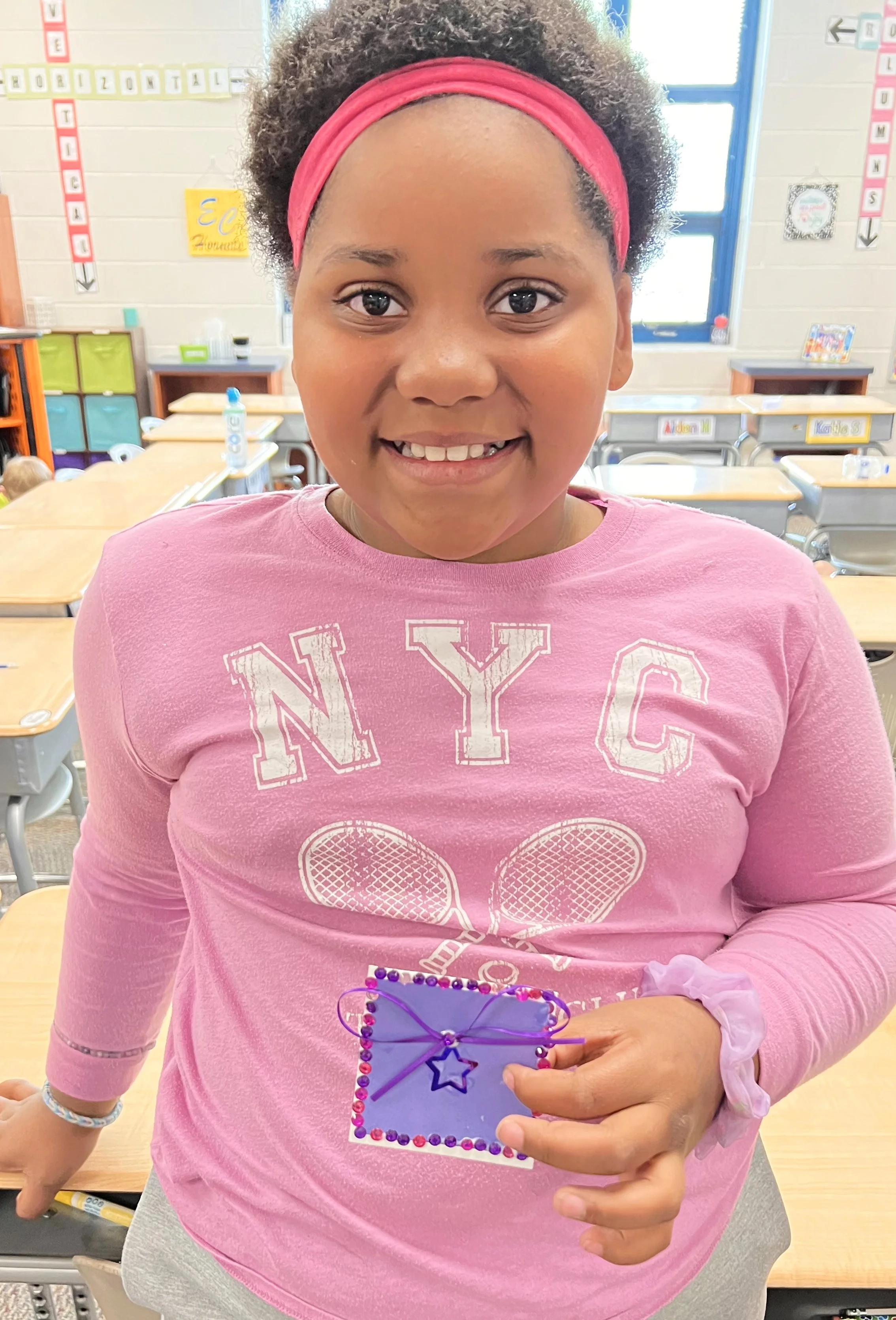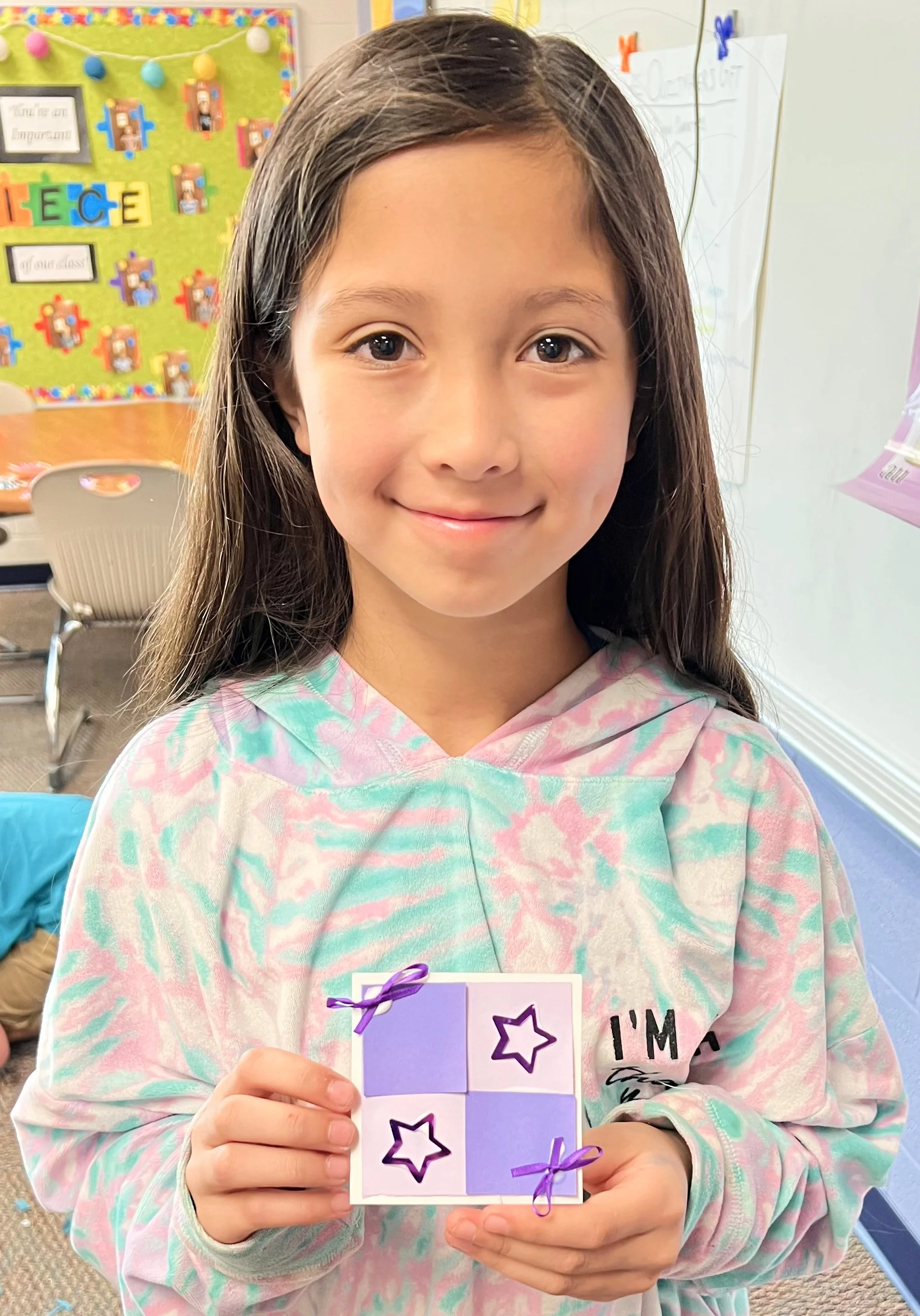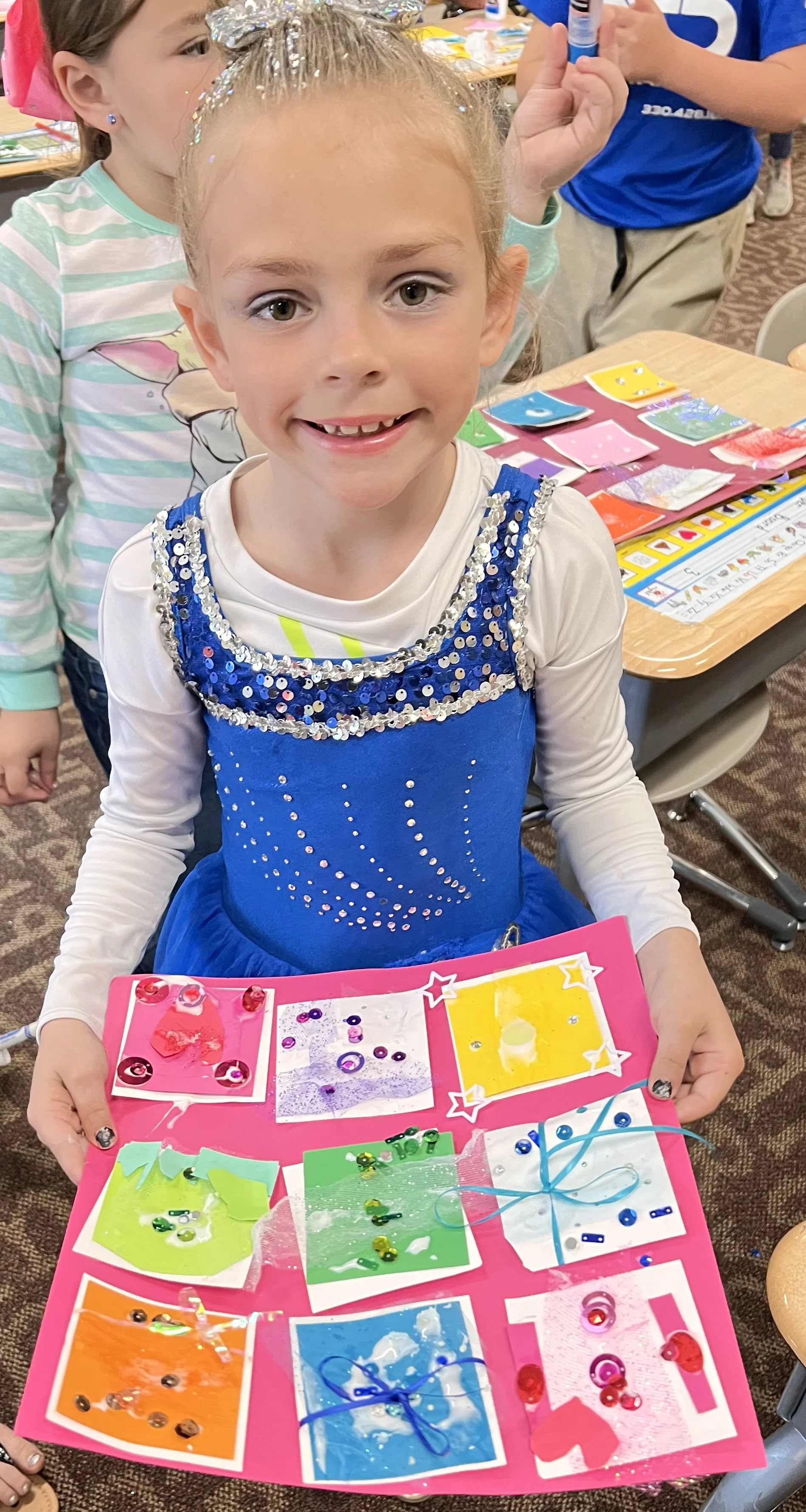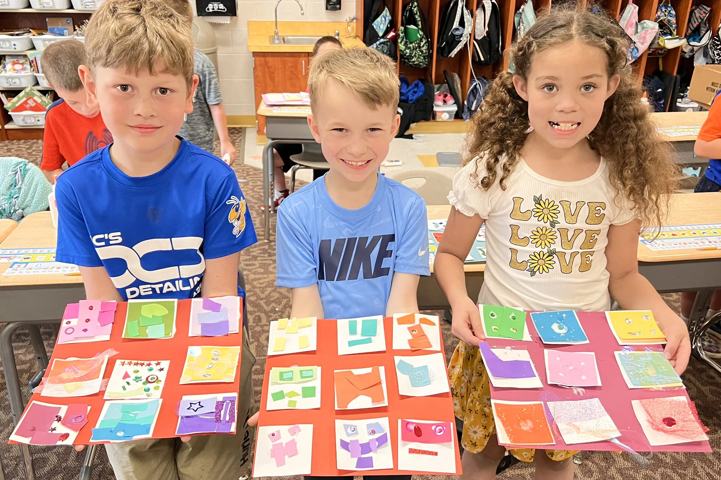 These kids read The Quiltmaker’s Gift, learning how giving and sharing are a part of community. The collage quilts came together by sharing colorful and tactile craft items to make their warm & cool squares that they put together for their own personal 9 square quilts and then contributed to their classroom community for the large classroom quilt.