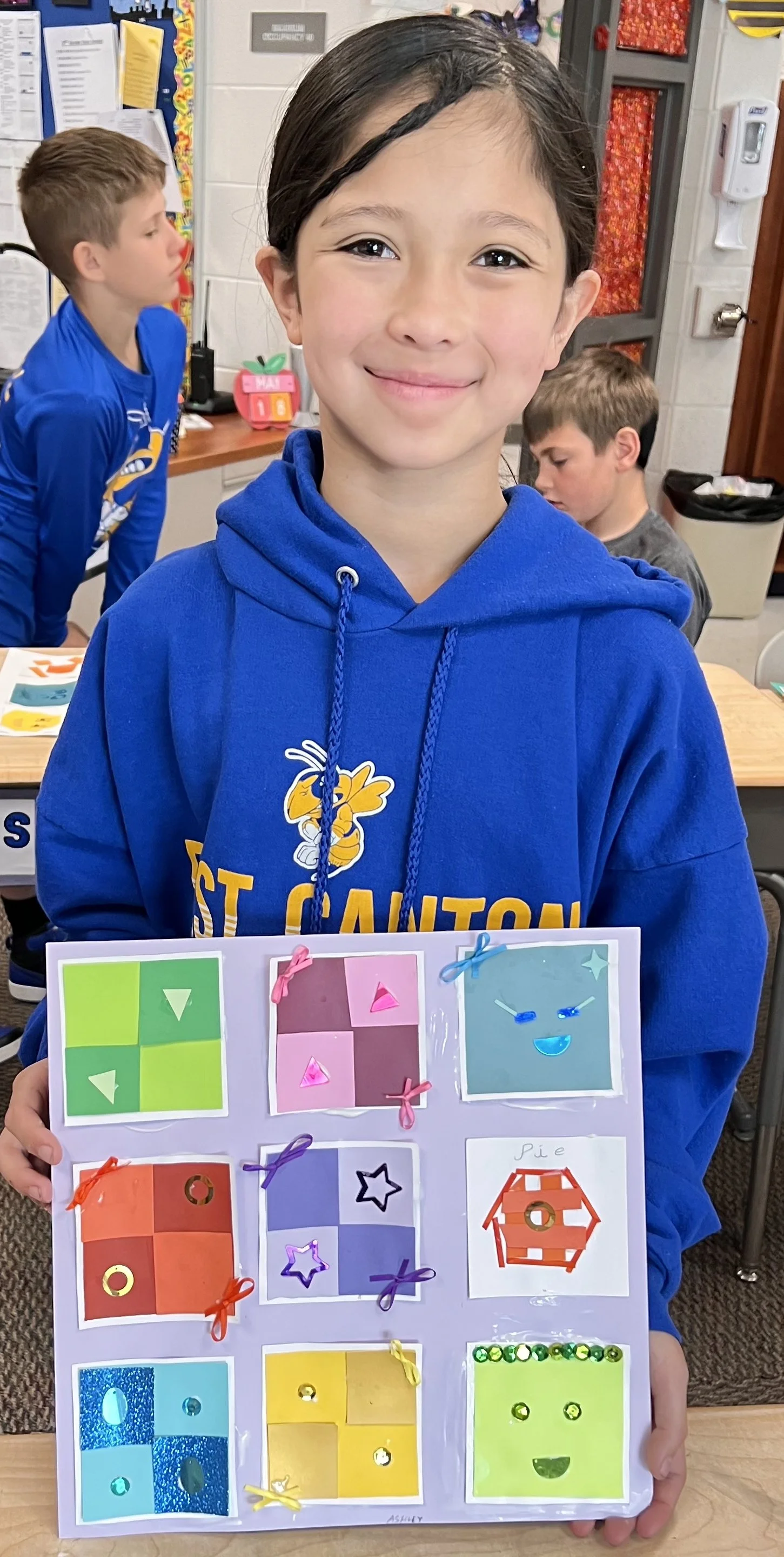 Kids Educational Art Project sponsored by Arts in Stark | Cardstock, glitter paper, cellophane, tissue paper, felt, sequins, gems | Quilt squares 6” x 6” each