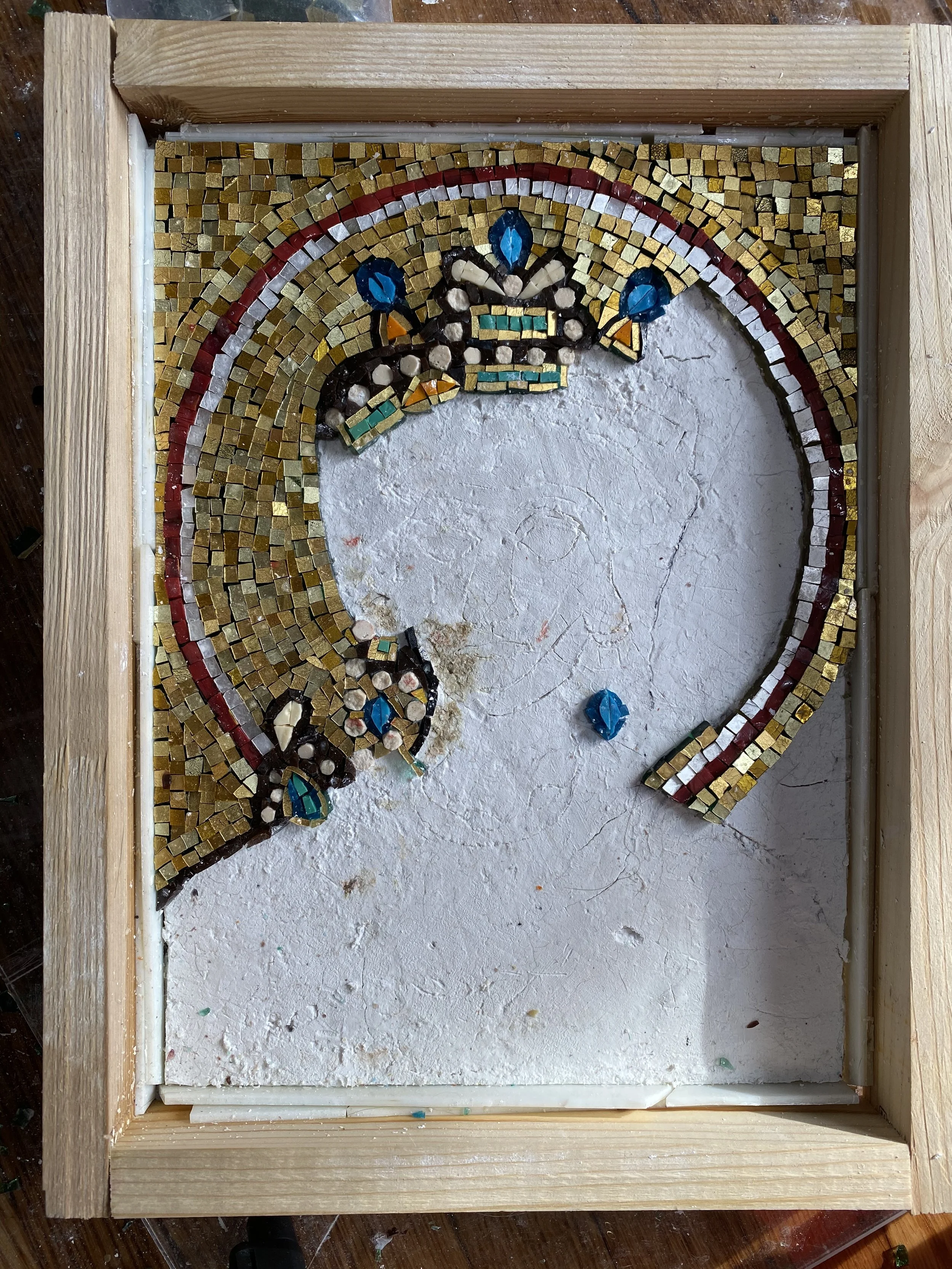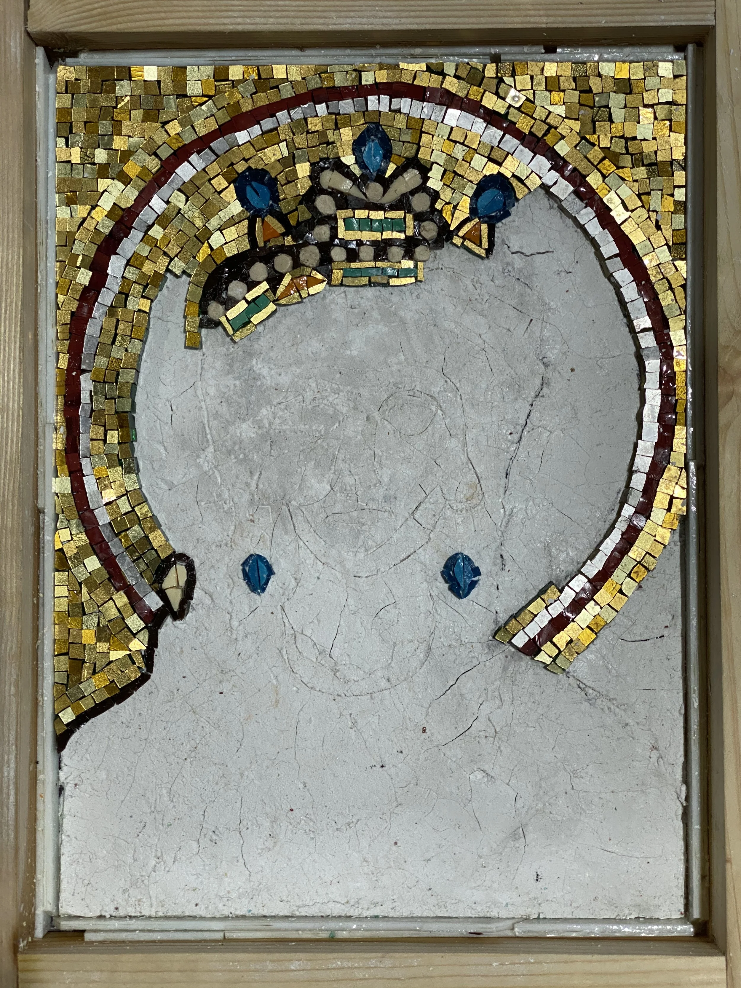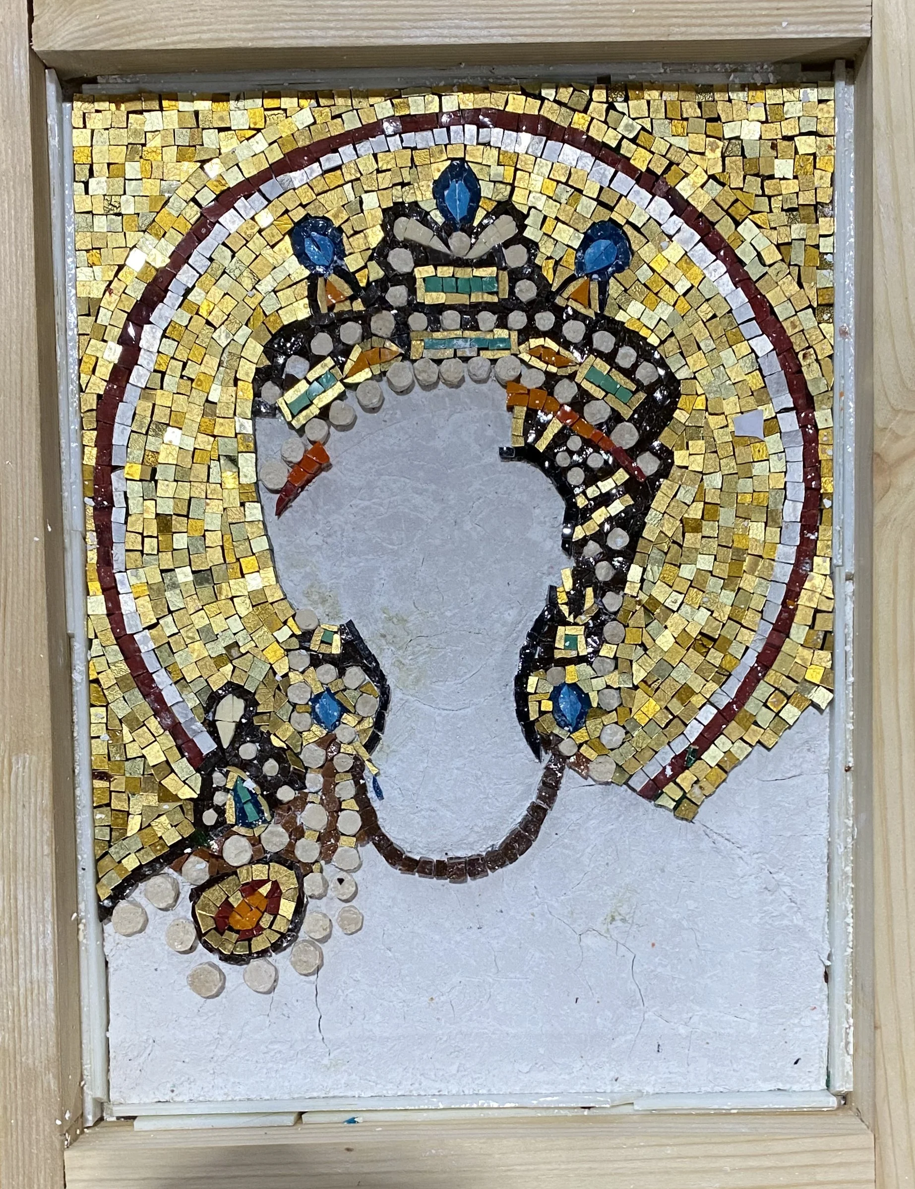 The halo around the original Empress Theodora is larger compared to her head than my version. Since the client wanted both pieces the same size and hung next to each other, we decided to switch up the ratio a bit. Other than that, I tried to replicate the mosaic as close as possible. I purchased Ravenna smalti and even found some antique gold smalti.