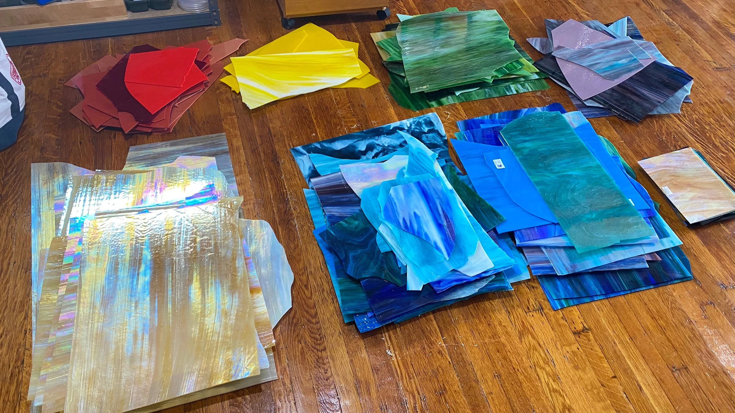 At the factory they have scrap glass available to pick through for $1 a pound. As you can see, it’s not just tiny shards, it’s large pieces of their gorgeous stained glass. Even Mango was enjoying the visit, though mostly because one of the employees shared his lunch with Mango.