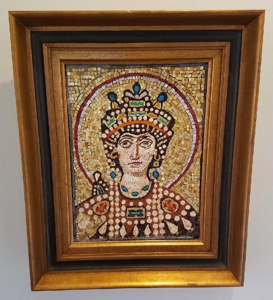 My Empress Theodora mosaic reproduction completed next to her partner, my client’s Emperor Justinian reproduction from Ravenna.