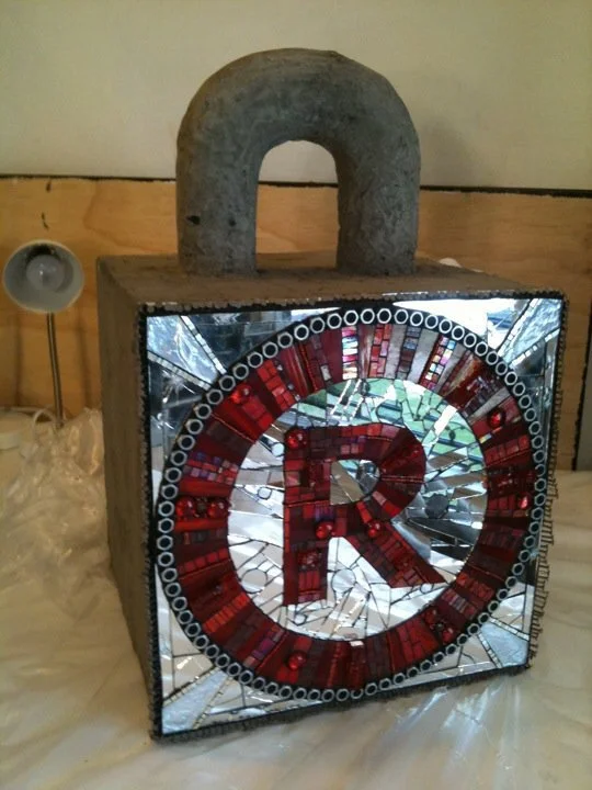 I had an idea for a series of mosaics made of mirror, red glass details, and hardware such as nuts, ball chain, nails, and washers. I started this one and another, then got really busy for about 3-4 years with commissions. Some of these commissions were 13 Red Bull Mirrored Disco Coolers and a few mirrored DecoBall lamps. By the time I had time to get back to my personal artwork, the last thing I wanted to do was mosaic with mirror.