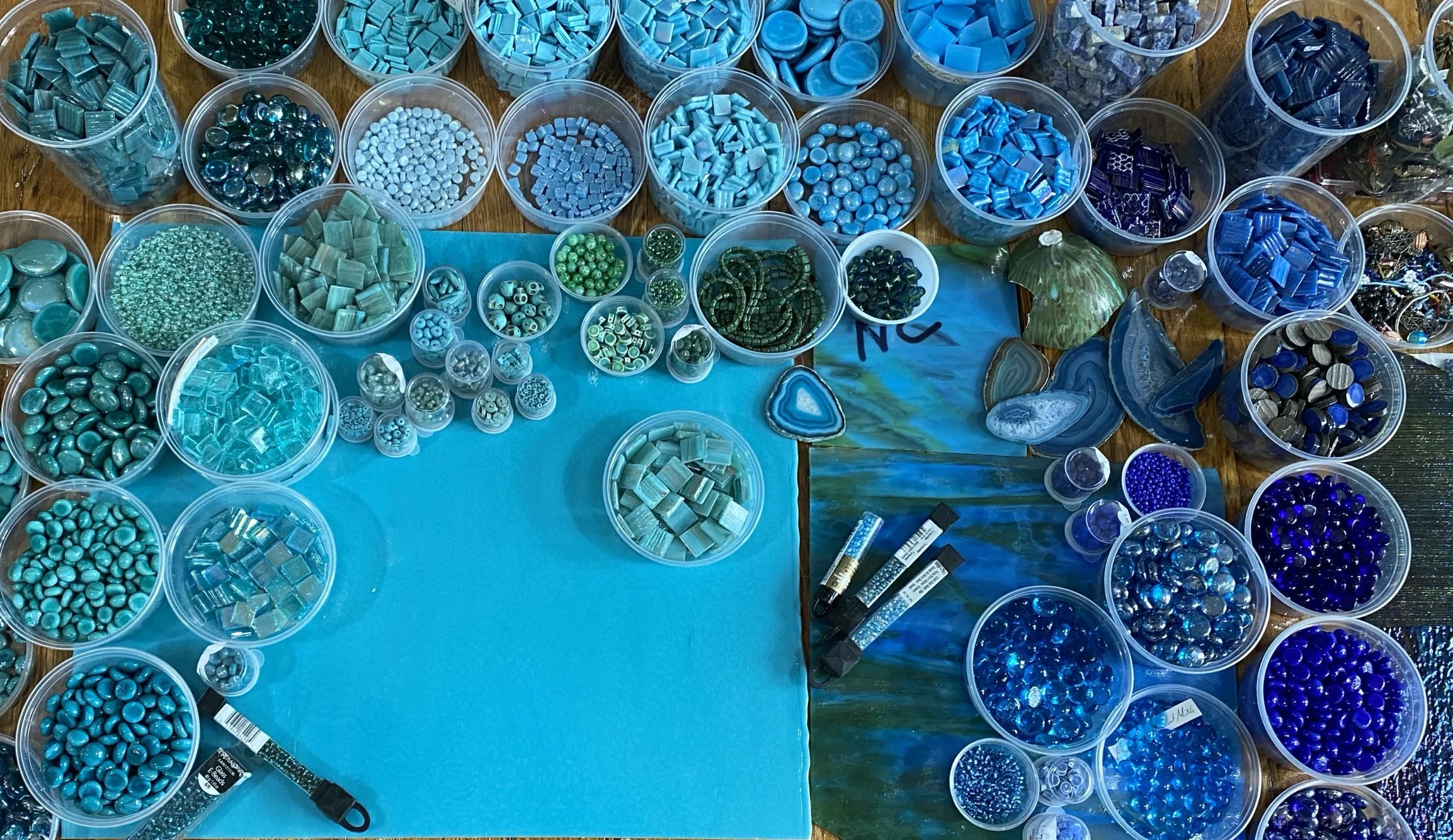 Next I’m going to pick out some gems. Here I have a variety of turquoise to blue, including iridescent and translucent gems for depth, and some milky tan gems in case I need them for the background.