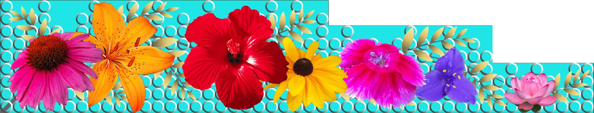 For the background color, I chose Tiffany blue because it’s lively and always classic. The metallic petals and seeds for the background patterning embolden the flowers without distraction while adding elegance and interest. The silver petals are lifting up and growing while the gold seeds bursting with energy.